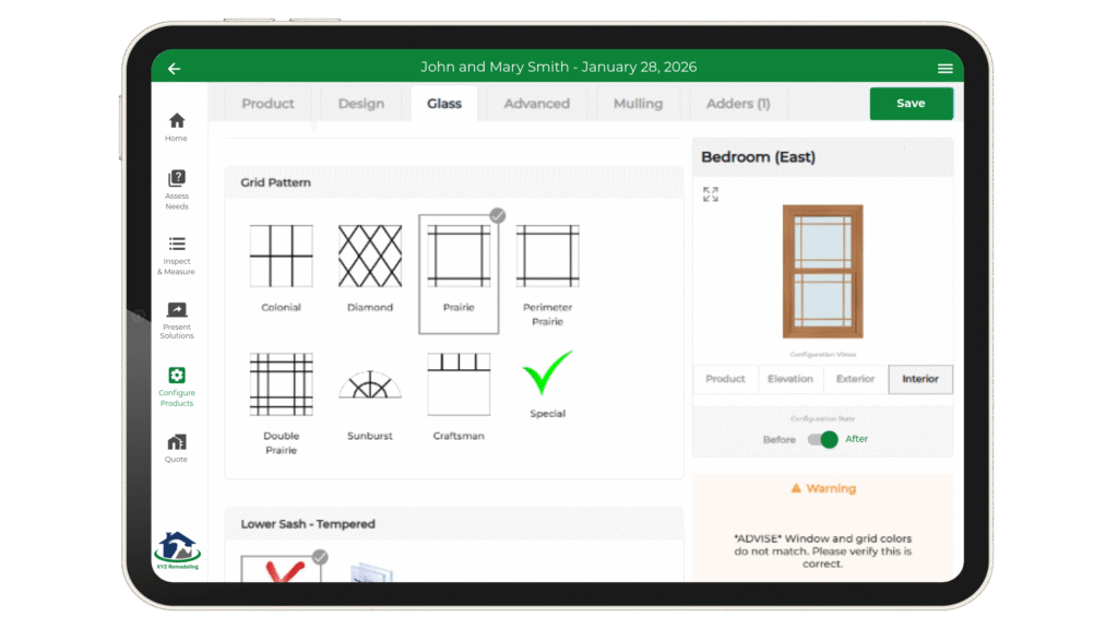 - On-tablet configuration tools that show the homeowner exactly what their new windows will look like
