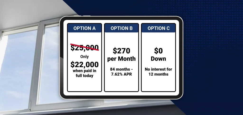And crucially, this means offering the customer options. Every homeowner has a different financial situation. Offering a cash price, a financing option with monthly payments, and a promotional offer (no money down for 12 months, for example) lets homeowners choose what works for them, not what’s easiest for you.